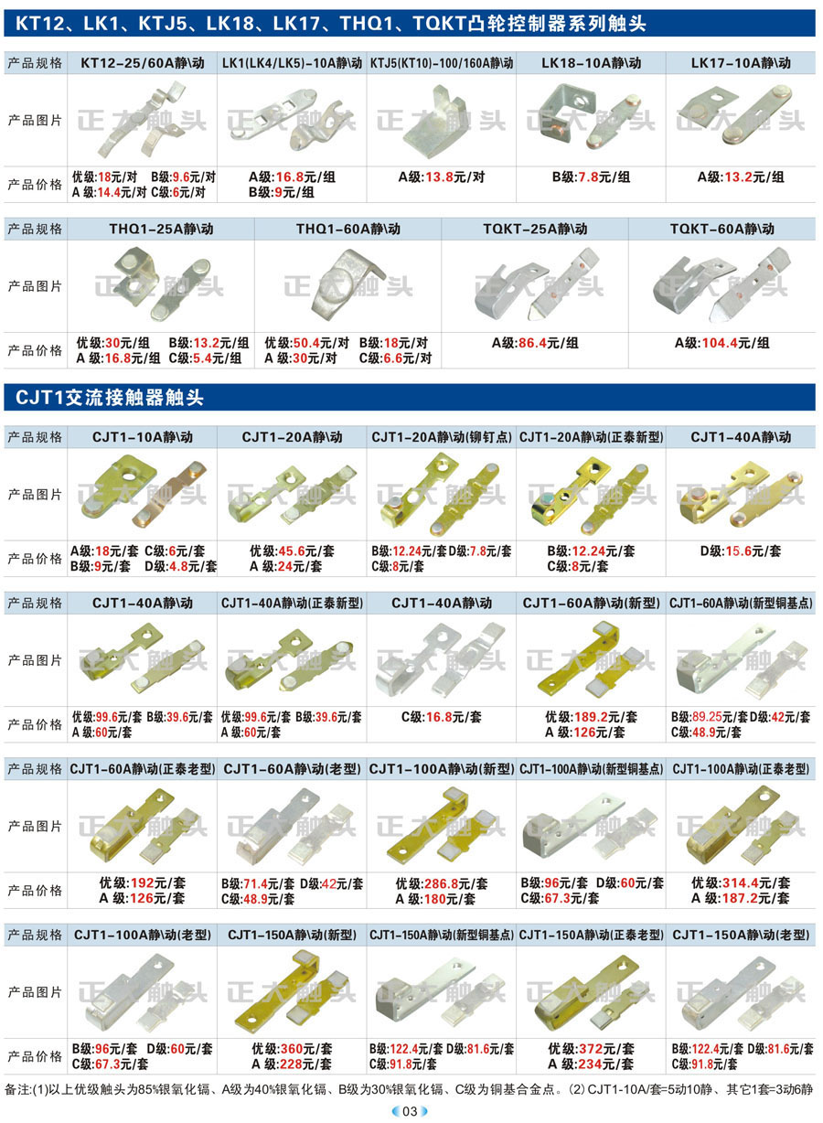 KT12、LK1、KTJ5、LK18、LK17、THQ1、TQKT凸轮控制器系列触头、CJT1交流接触器触头
